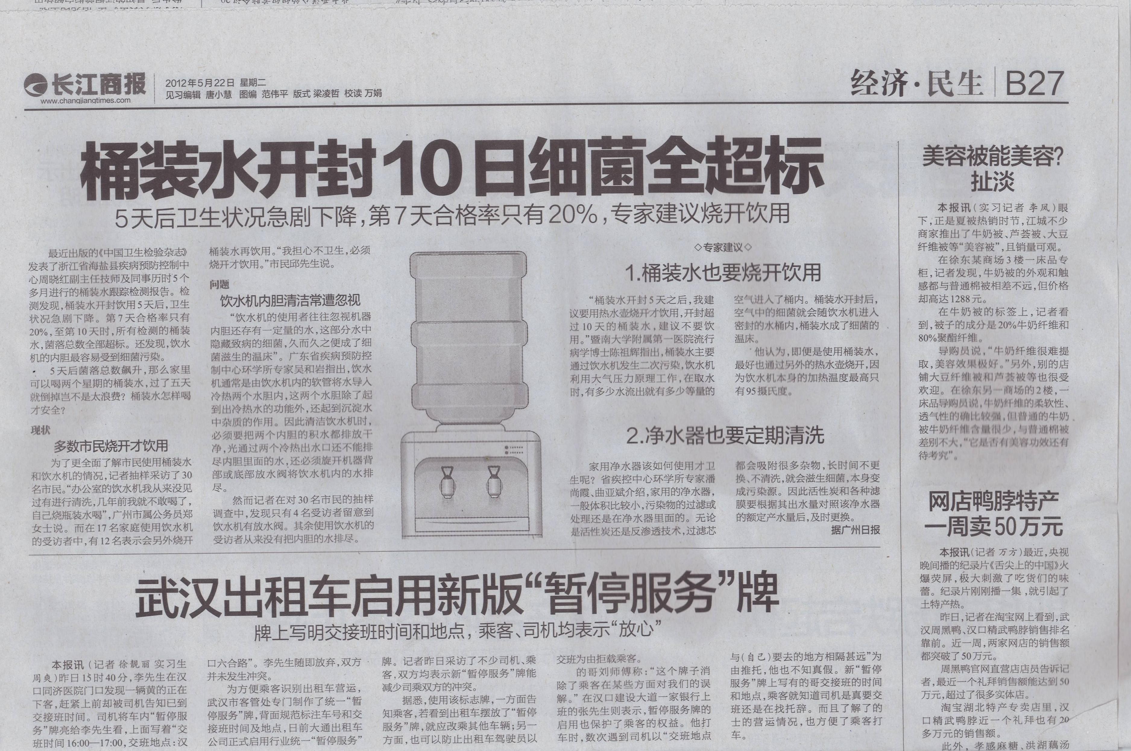 與傳統(tǒng)的自來(lái)水、燒開(kāi)水相比,桶裝水的普及已經(jīng)成為了飲水方式的第二代,在大部分用戶心中,桶裝水都被認(rèn)為是干凈、安全的;然而,我國(guó)之前進(jìn)行過(guò)多次瓶(桶)裝飲用水產(chǎn)品抽檢,合格率僅為77%,且當(dāng)桶裝水開(kāi)封5天衛(wèi)生狀況急劇下降,第7天合格率僅20%,開(kāi)封10天細(xì)菌全超標(biāo)(以上簡(jiǎn)報(bào)摘自長(zhǎng)沙商報(bào));